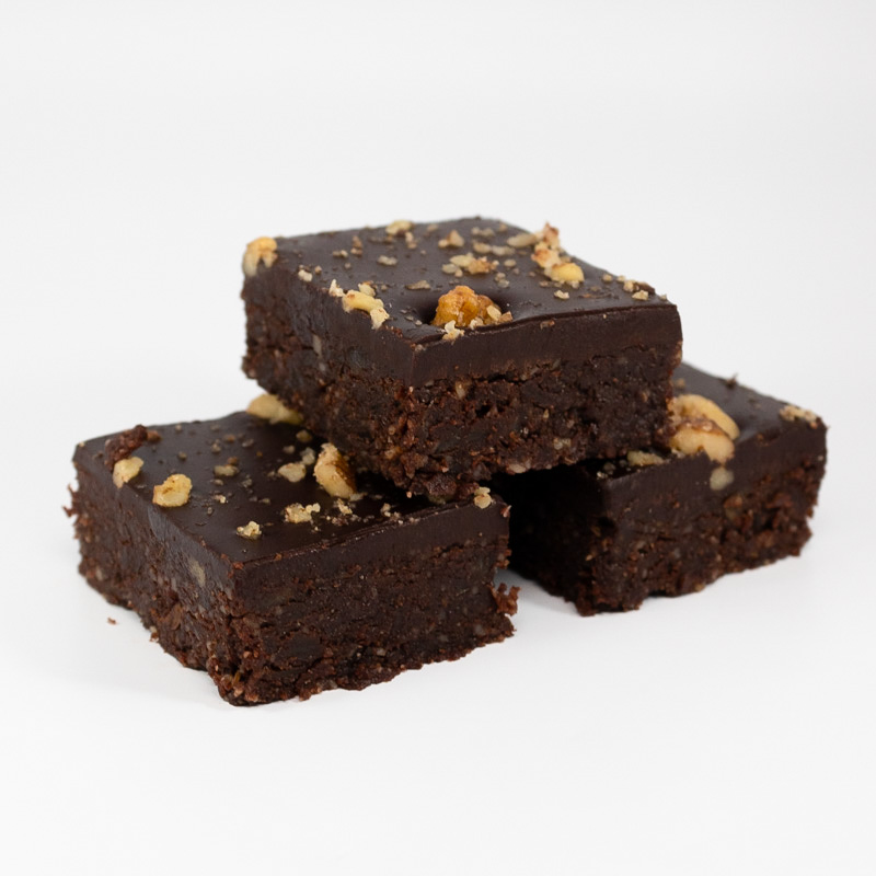 Saftig raw food brownie laget av valnøtter og dadler, med en mørk sjokolade glasyr. Gojibær og valnøttebiter kommer som standard topping.