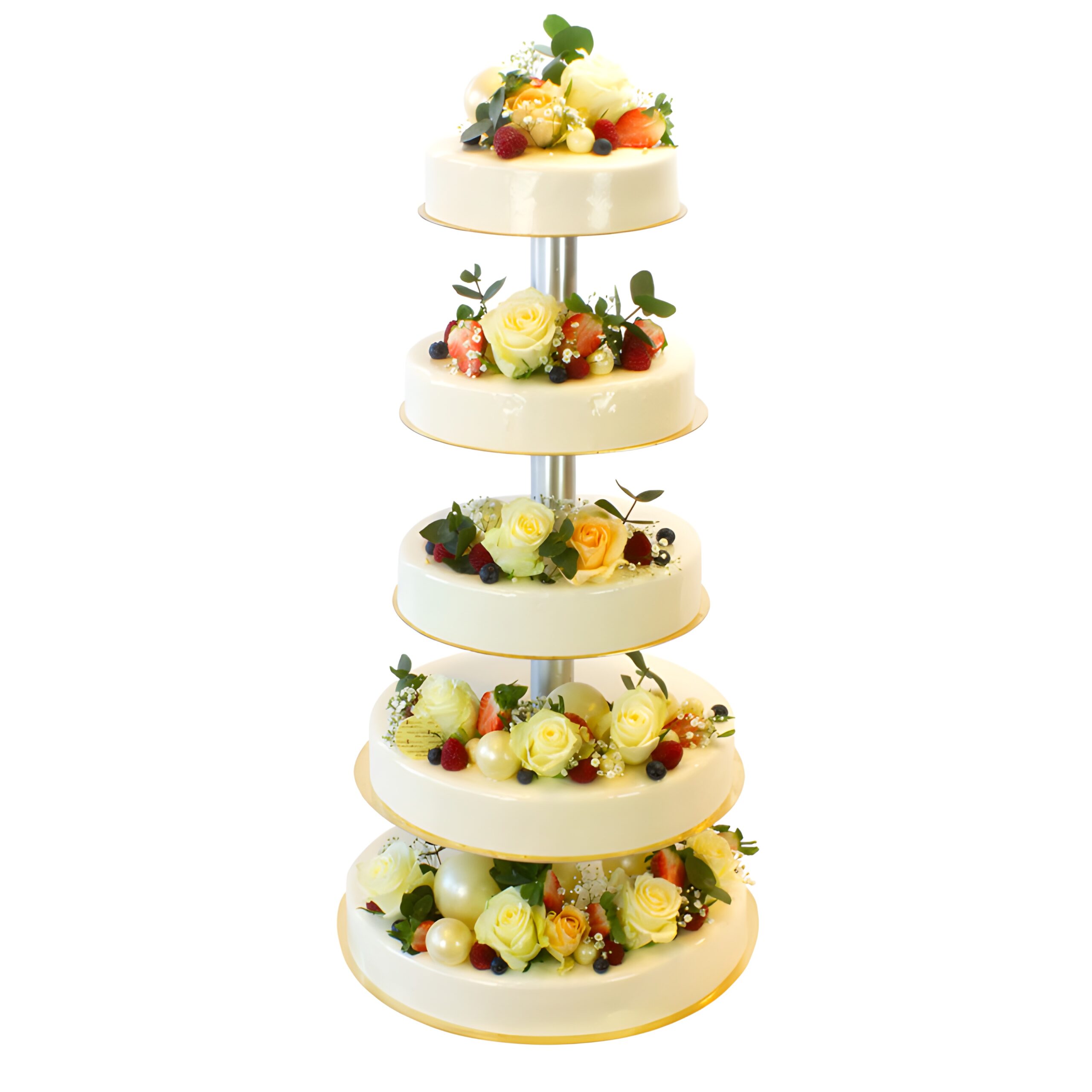 Stativene våre varierer fra 1 til 5 etasjer. Antall etasjer vil avhenge av størrelsen på kaken. Det finnes mange mulige kombinasjoner av kakestørrelser og etasjer, men under har vi listet opp den minste kakestørrelsen som kreves for å kunne bestille hver av etasjene. Det er med andre ord ikke mulig å få en kake til 30 personer med 3 etasjer, men det er mulig å få en kake til 45 personer med 2 etasjer.