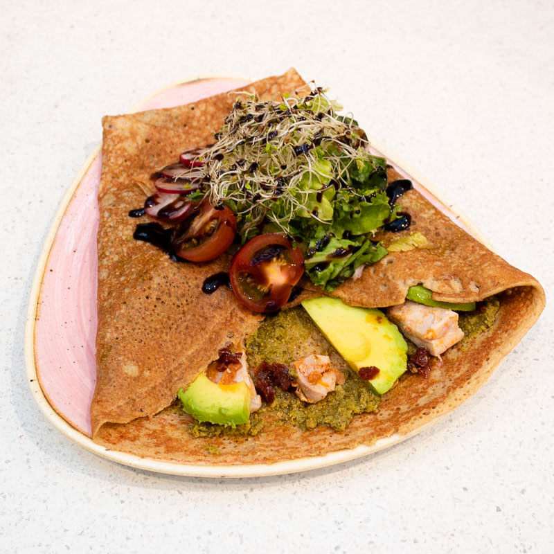 En deilig salt crêpe med proteinrik tunfiskmajones, smakfull pesto, fersk avokado og soltørkede tomater.