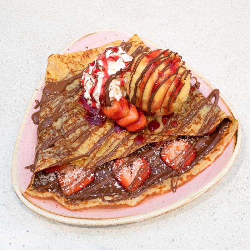En deilig søt crêpe med nutella, ferske jordbær og kokosmasse toppet med smeltet belgisk melkesjokolade, krem og melis. Anbefales med vanilje iskrem. Friskt og søtt!