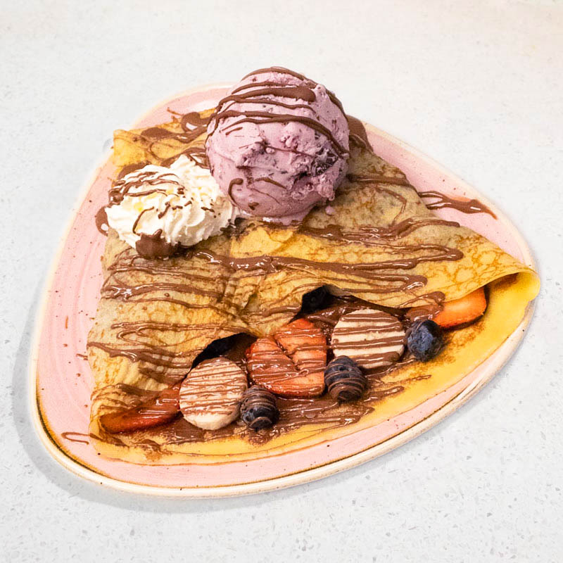 En deilig søt crêpe med nutella, ferske jordbær, blåbær og banan toppet med smeltet belgisk melkesjokolade, krem og melis. Anbefales med kirsebær iskrem. Perfekt for bær elskeren!