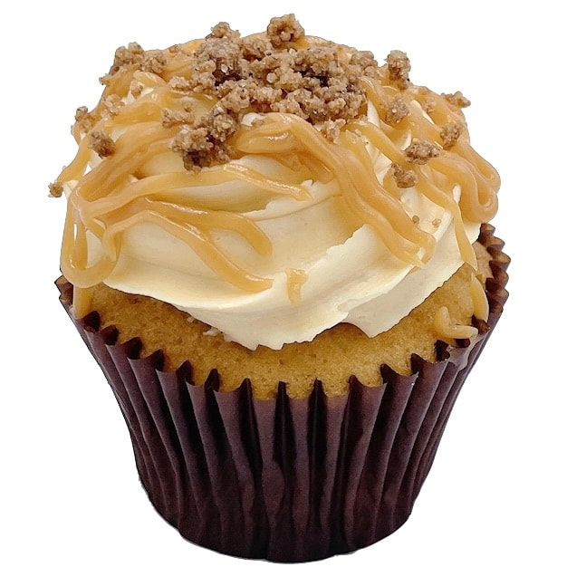 Nyt en luftig og smakfull vaniljecupcake fylt med eplekompottfyll og toppet med en delikat karamellsmørkrem.