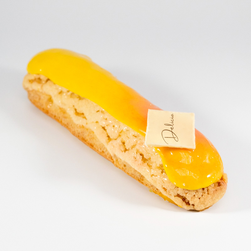 Fransk éclair fylt med en smaksrik og fyldig mangokrem på innsiden og toppet med hvit sjokoladeglasur. Den friske og eksotiske smaken av mango gjør desserten lett og oppfriskende.