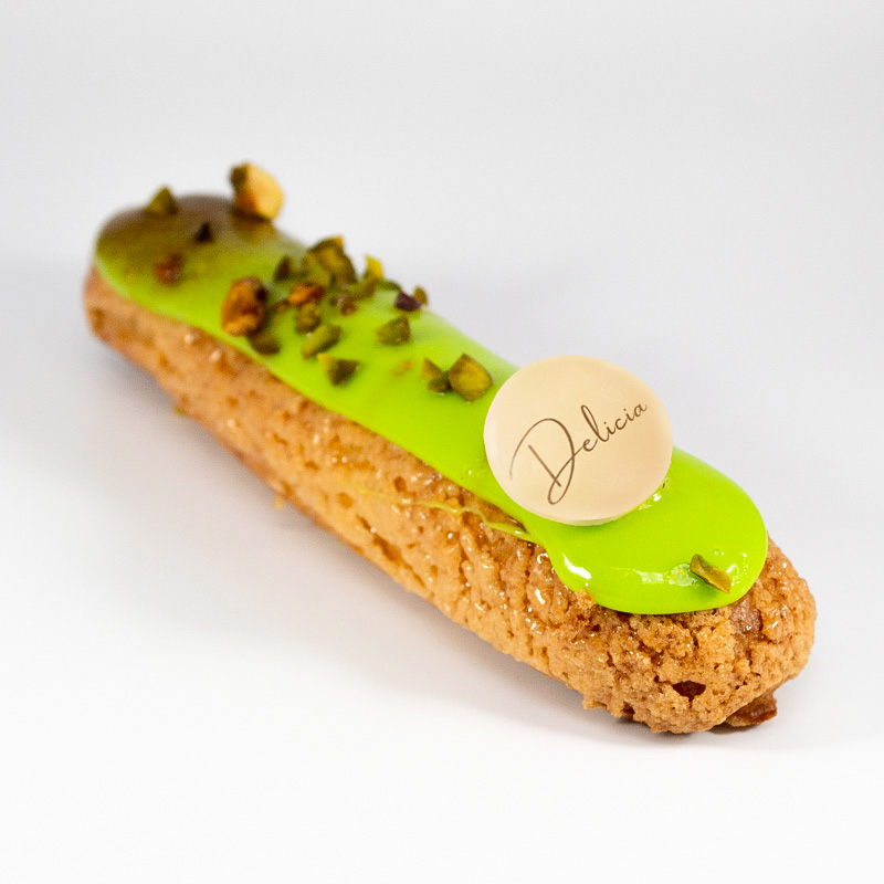 Fransk éclair fylt med en smaksrik og fyldig pistasjkrem på innsiden og toppet med hvit sjokoladeglasur og hakkede pistasjnøtter. Den rike nøtteaktige smaken fra pistasjnøttene passer perfekt i en dessert.