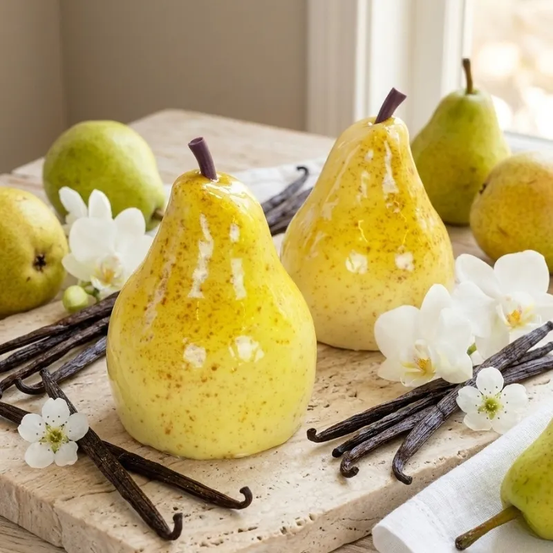An elegant dessert shaped like a perfect Williams pear with a high-gloss and refined surface. Beneath the mirror-like layer is a velvety mousse with the aromatic taste of ripe pear and a rich pear compote at the core, which provides a balanced combination of natural sweetness and freshness. The dessert rests on a juicy almond base with a light nutty touch that adds structure and a harmonious taste experience – a small work of art and an exclusive end to any meal.