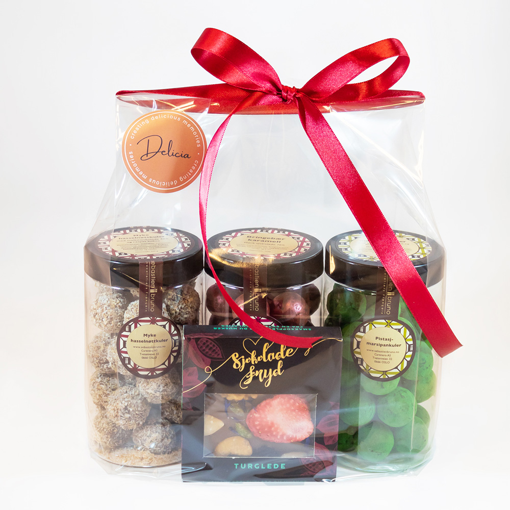 Prøv et våre populære gaveposer. Passer perfekt til en hyggelig gave! Denne gaveposen inneholder 1 stk Bringebærkaramell, 1 stk Pistasjmarsipan, 1 stk Myke hasselnøttkuler, og 1 stk Turglede melkesjokoladeplate.