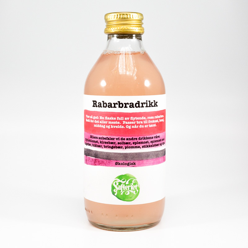 En flaske full av flytende, rosa rabarbra. Økologisk og godt for det aller meste. Rabarbrablandingen inneholder 6-7 forskjellige sorter, for å få den perfekte blandingen.