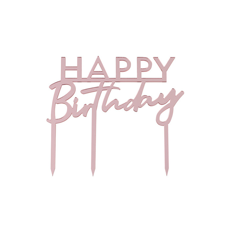 Kaketopp på 11 x 12 cm med teksten «Happy Birthday» i rosa. Putt den på toppen av kaken for å gjøre den ekstra fin og spesiell.