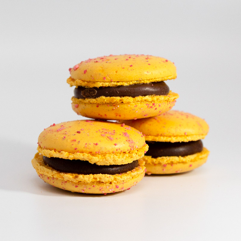 Melkesjokoladeganasj smaksatt med pasjonsfruktpuré. Frisk, litt syrlig og veldig god. God til både kaffe og te! Makronene kommer i 6pk, 8pk, 12pk og 20pk, mens øvrige antall blir pakket i cellofanposer.