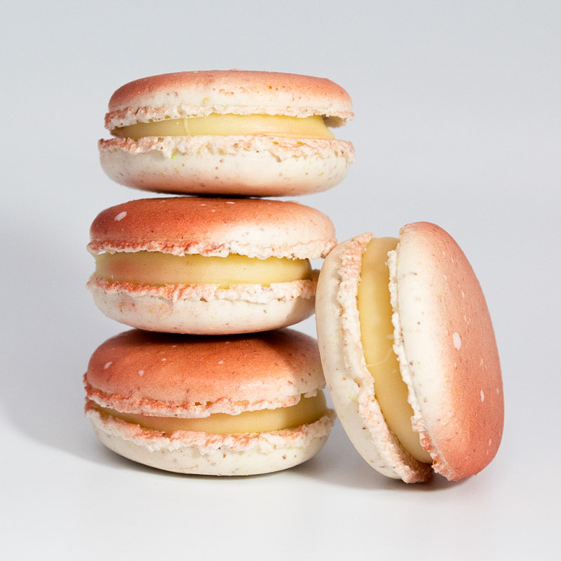 Hvit sjokoladeganasj med kremfløte smaksatt med jordbærkompott og vanilje fra madagasker. En mild og søt smak som passer de fleste. Makronene kommer i 6pk, 8pk, 12pk og 20pk, mens øvrige antall blir pakket i cellofanposer.