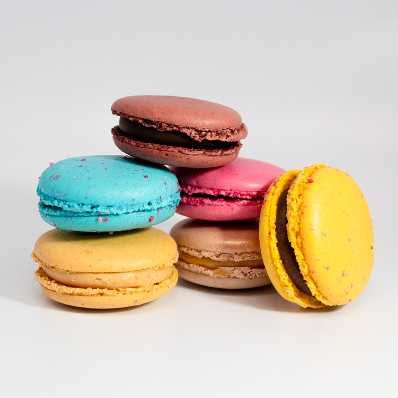 mandel, sukker, eggehvite, melis og naturlig konditorfarge. fyll: sjokolade (mørk, lys, hvit), fløte, fruktpuré (pasjonsfrukt, multe, solbær osv.), sukker, te, krydder, kaffe. ganasj: fløte blandet med sjokolade. soyalecitin og kakao. nøtter (pistasj, hassel, pekan, osv.)