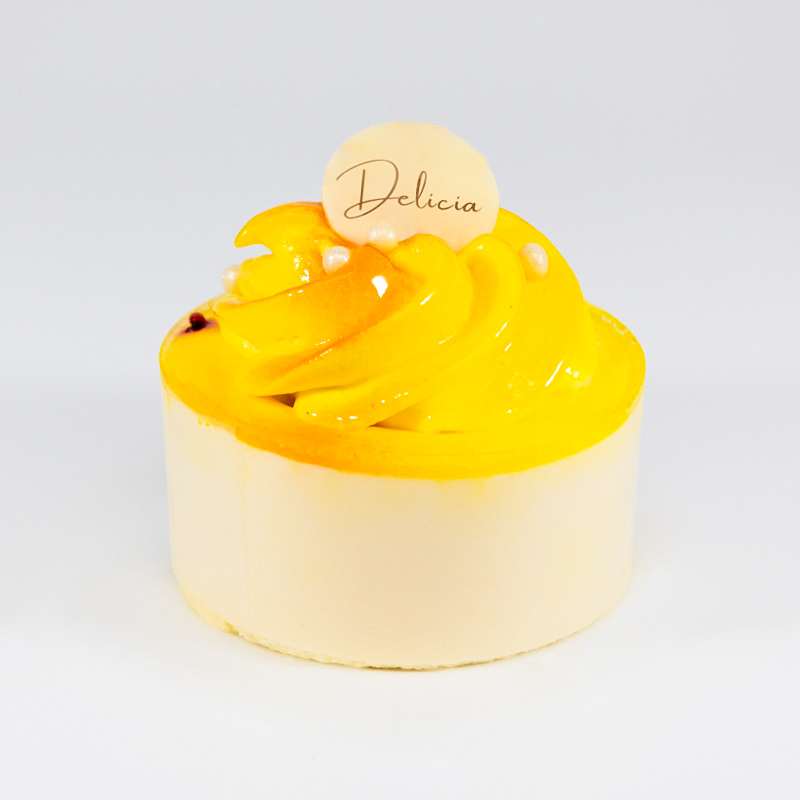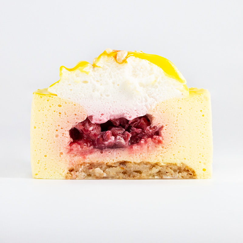 En syrlig og frisk pasjonsfrukt mousse med bringebær coulis fyll på innsiden og mandelbunn. Passer perfekt som en oppfriskende dessert og er midt i blinken for de som ikke ønsker en alt for sukkersøt avslutning på måltidet. Kaken er glutenfri, og kan tilpasses etter ønske med ekstra pynt og skrift. Kaken kan også kjøpes som stor kake i flere størrelser.