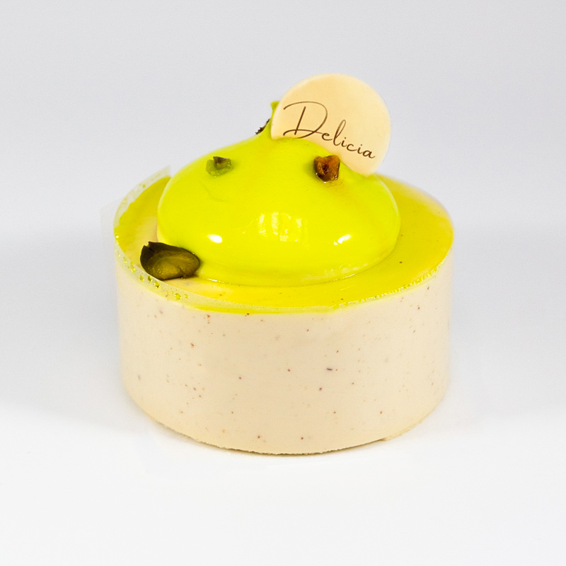 Mild og søt pistasjmousse med friskt bringebær coulis fyll på innsiden og mandelbunn. Den nøtteaktige smaken sammen med bringebærenes friske undertoner gir en spennende smakskombinasjon. Kaken er glutenfri, og kan tilpasses etter ønske med ekstra pynt og skrift. Kaken kan også kjøpes som stor kake i flere størrelser.